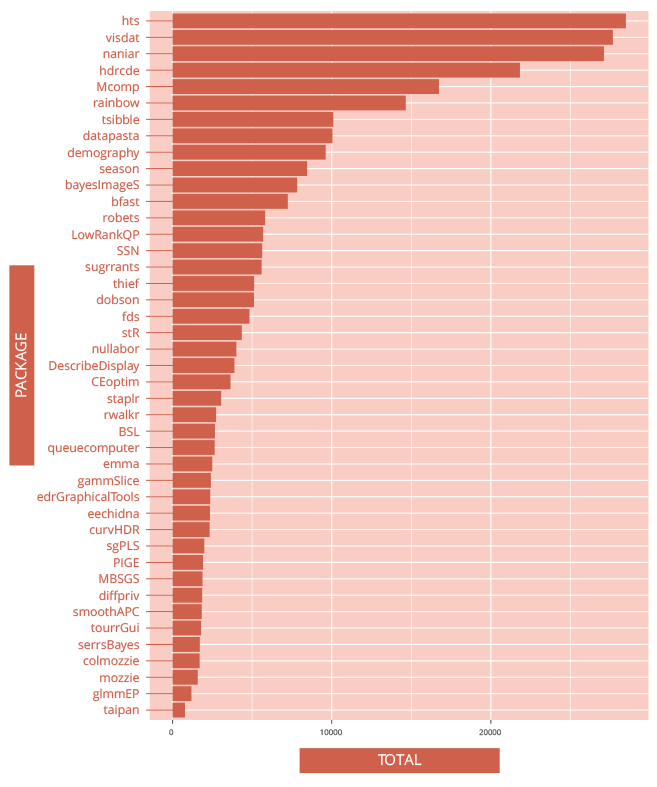 The following graph shows all packages authored by ACEMS members other than those downloaded more than 30,000 times during 2018.