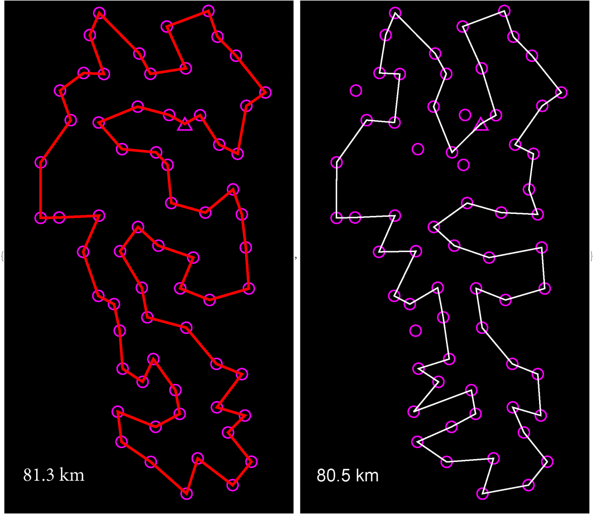 Left: The calculated shortest route to clean the course using the travelling salesman function in Mathematica. Right: Actual route traversed by State Champion team.