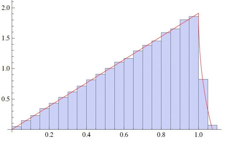 Comparison of numerically generated distribution for the magnitude of the shortest lattice vector in two dimensions for a basis chosen with invariant measure, and the theoretic prediction.